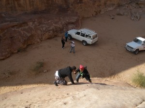 The cab driver pressed the accelerator down to the floor, shuttling his human cargo as quickly as he could.  Red desert, stark mountains, and the occasional camel flew past.  We stopped only for military checkpoints supervised by solemn men in military garb, large automatic guns slung nonchalantly on their hips.  We drove in silence.  Not knowing where we were going, I questioned again our decision not to wear headscarves.  The night before we saw women socializing in the streets of Aqaba, a welcome change after our week in Egypt, where we saw few women out in public.  Still, the women in Aqaba all wore headscarves.  I thought back to a previous visit to Cairo, when we walked up to an Egyptian friend that we adore, slightly uncertain of the silk headscarves that we’d tied on with varying degrees of success.  We knew we were faking it, but didn’t know what else to do.  Our friend smiled and asked, “Are you Muslim?”  Long silence.  “Then you don’t need to wear them.”  We haven’t worn headscarves since.
