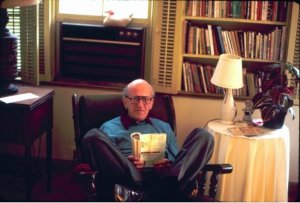 Late summer evenings, circles of adult cousins in the living room lounging on the comfy couches by the fireplace.  The smell of red wine and sounds of quiet talking and comfortable laughter.  Uncle Gene lying on the floor, his head resting lightly on an old, squashed football.  Afternoons with Uncle Gene and Aunt Peggy reading in their study, with Uncle Gene always in his favorite, well-worn chair, legs crossed underneath him, the very picture of a wise swami.  When we had to say goodbye, a retreating image of both our Aunt and Uncle waving goodbye from the front yard, madly waving not just both hands but also one foot simultaneously.  These are the childhood memories that have become a living part of me, brimming under the surface of my consciousness.